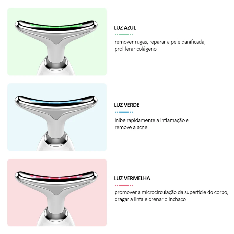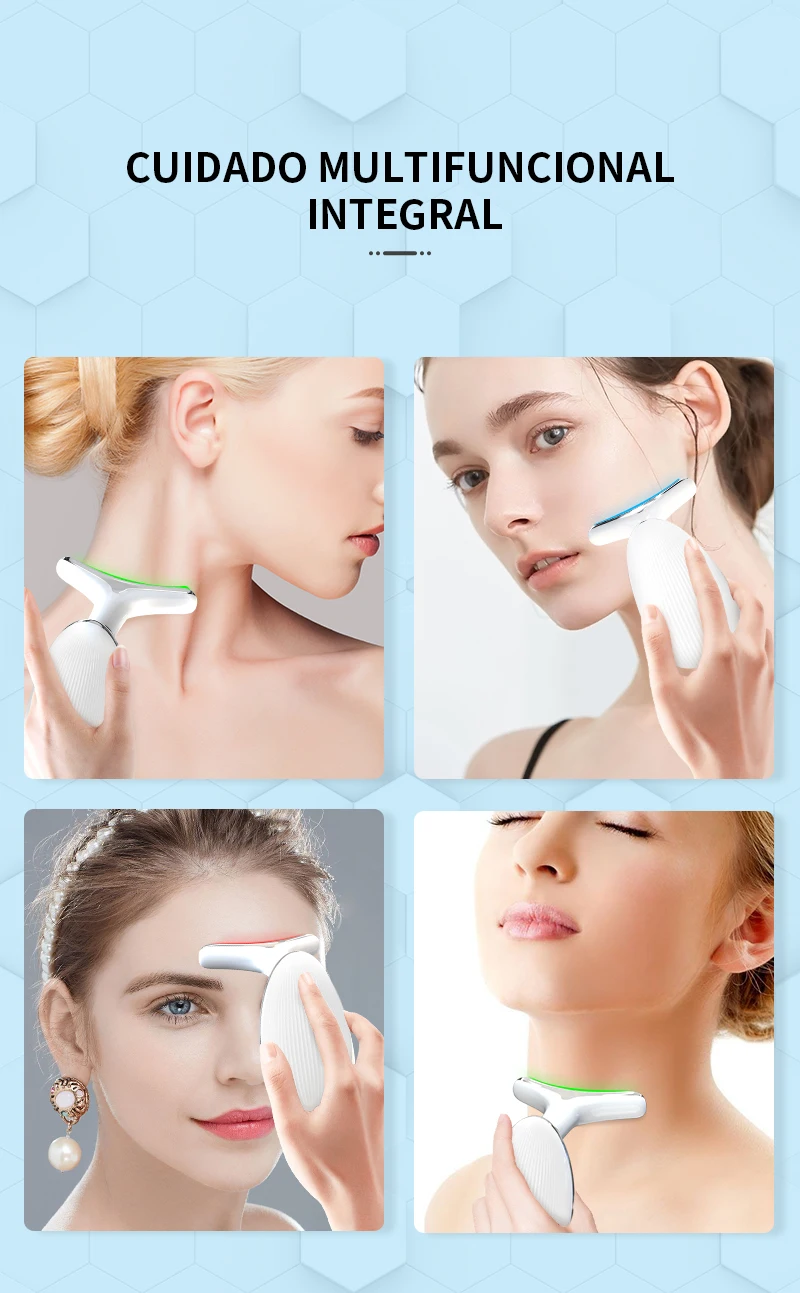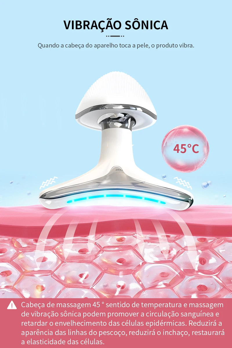 O Derma-Neck é um dispositivo inteligente que funciona por meio de tecnologia de vibração ultrasônica para relaxar os músculos do pescoço e ajudar a firmar a pele do pescoço.